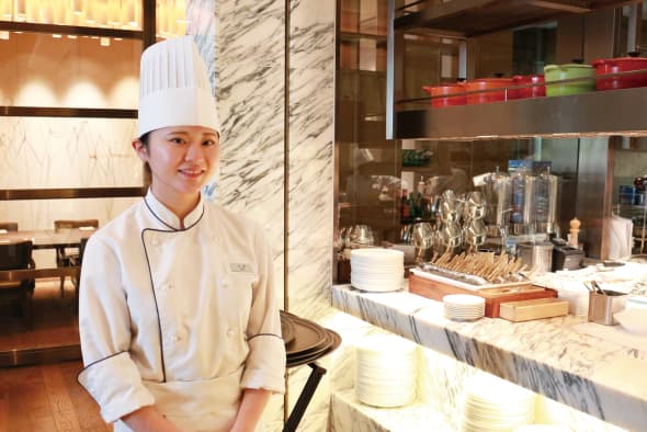 お客様から「美味しかったから何度もおかわりを取りに来ちゃった!」などの言葉をかけていただけると、頑張って良かったと思えます。また、今はレストランやルームサービスだけでなく鉄板焼きの仕事もしていて、出来ることが増えていくやりがいを感じています。