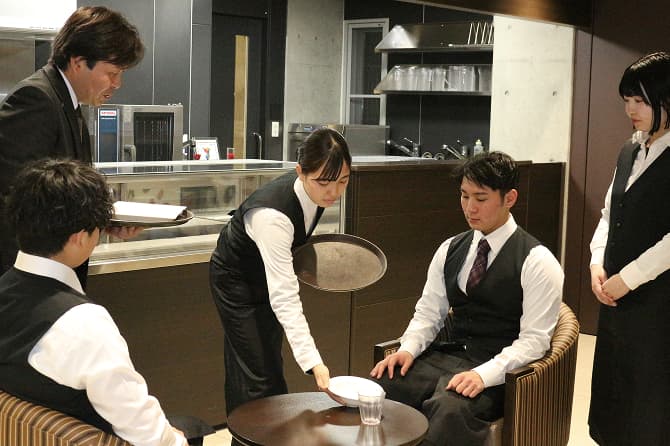 実店舗をイメージし、【調理・接客・お客様】の役割のもとに、演習を行います。より現場を知るために、ホスピタリティ・接客ベーシックの授業で学んだ事をシミュレーションします。